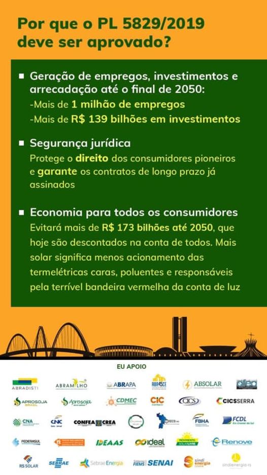 O projeto de lei PL 5829/2019, que definirá as regras para a geração distribuída, está na pauta da câmara para ser votado hoje ainda. Ele oferece a segurança jurídica que tanto precisamos para manter empregos e investimentos, e para garantir acesso de toda a população à energia solar fotovoltaica.