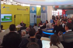 O workshop gratuito do último dia da feira ocorreu numa sala com 180 lugares gratuito. A procura superou a oferta e deixou alguns do lado de fora. Pedimos desculpa e prometemos organizar isso melhor no ano que vem. Notamos interesse especial pelo software PV*SOL, com inúmeras perguntas no estande. E já recebemos vários pedidos de compra, apoveitando o desconto especial de 25%, que já dá direito para a versão em português (previsão outubro próximo). Interessado? Acesse o formulário aqui já - a promoção vale só até 8 de setembro, junto como a promoção dos cursos PV*SOL e PVSYST.