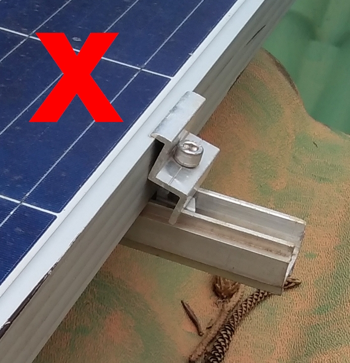 O exemplo de hoje mostrar grampos errados, encontrados durante uma visita recente. Na imagem è direita percebe-se que o grampo não está alinhado com o módulo. Somente uma parte pequena dele está segurando a moldura do módulo, deixando dúvidas se um vento não arrancaria a peça.
