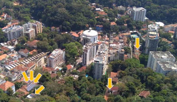A segunda abordagem é visual. A foto ao lado mostra a vista superior do bairro Cosme Velho, no Rio de Janeiro, moradia de classe média a alta. Marquei os sistemas fotovoltaicos - contamos apenas seis instalações neste mar de telhados.