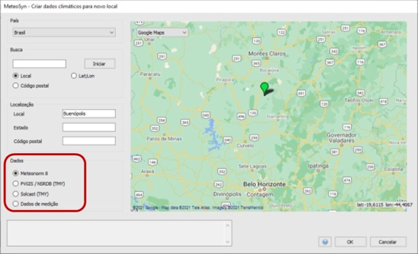 - Ainda com a marcação em "Meteonorm", você clica no mapa no local para quais você vai inserir dados. Aparece um alfinete verde e os dados da localização;