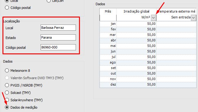 - Os dados devem ser do plano horizontal! O PV*SOL calcula a irradiação para o(s) plano(s) dos módulos;