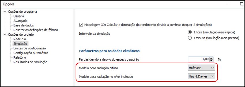 PV*SOL permite ao usuário escolher o algoritmo aplicado para calcular tanto a radiação difusa no plano horizontal quanto a radiação difusa no plano inclinado (isto é, o plano dos módulos). Pesquisamos fontes científicas que tratam desse tema e encontramos um único trabalho, frequentemente citado: