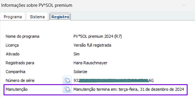 Em paralelo à leitura aqui, entre no software PV*SOL e consulte o final da sua manutenção no menu Ajuda -> Registro (imagem ao lado).
