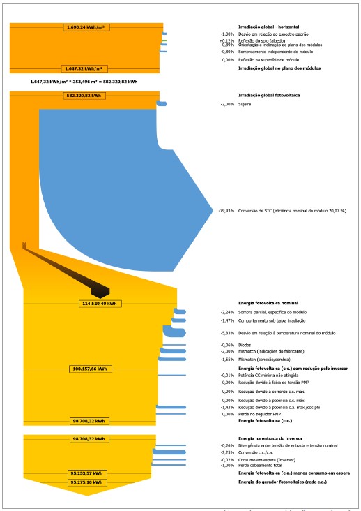 O diagrama Sankey apresenta perdas e ganhos de energia no sistema e é bem conhecido por usuários do PVsyst. Ele traz as mesmas informações da tabela do balanço energético e está disponível nos resultados e no relatório.